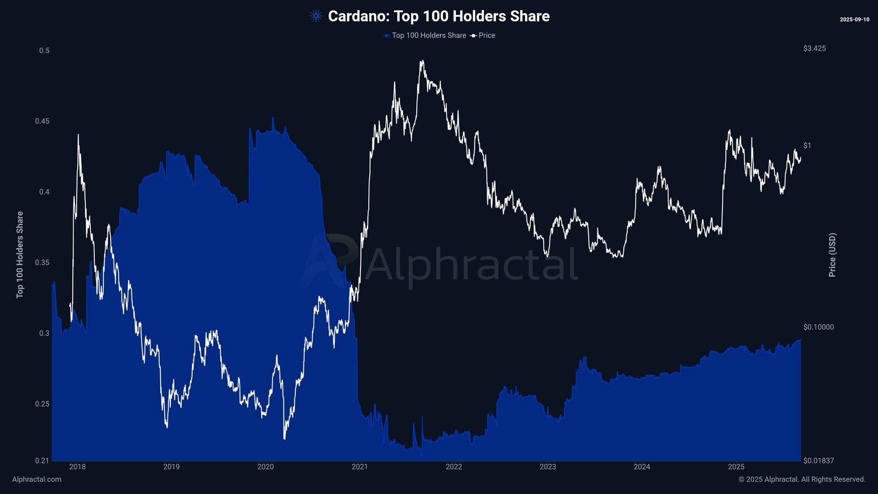 En una publicación en X, el fundador de Alphractal, Joao Wedson, señaló que las ballenas también estaban acumulando más ADA. El 29.6% del suministro total está en manos de las 100 direcciones principales, como lo demuestra su métrica de participación.