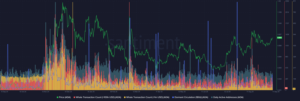 Los tenedores a largo plazo poseían el 54% de los tokens Cardano disponibles. La acumulación de ballenas y la tenencia de LTH fueron una clara señal de la convicción alcista en el proyecto por parte de los principales inversores. Sin embargo, también representan un riesgo de venta concertada por parte de las ballenas.