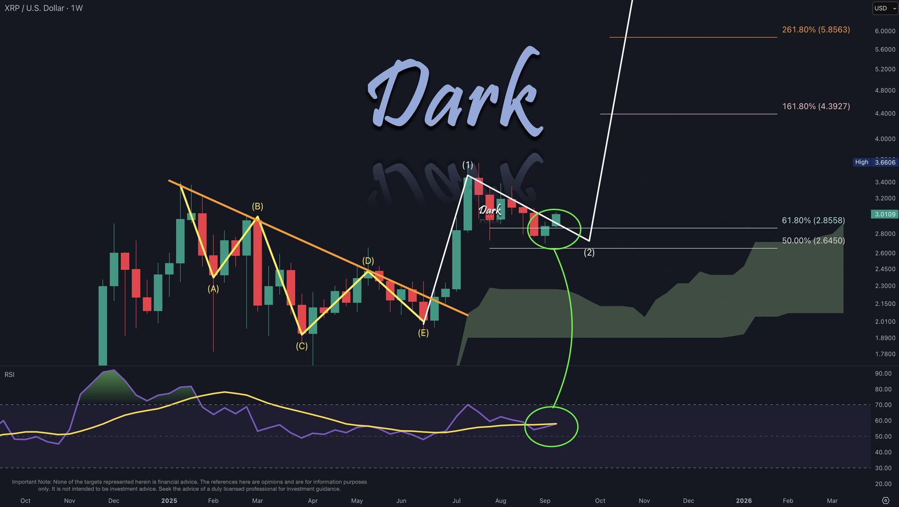 “XRP ha superado un nivel de resistencia semanal clave, rompiendo una línea de tendencia descendente de larga data”, según Dark Defender en X. Esta estructura había limitado los avances del precio durante meses. La ruptura marca la finalización de una fase correctiva que comenzó a principios de este año, marcada por un patrón de cinco patas A-B-C-D-E en el gráfico.