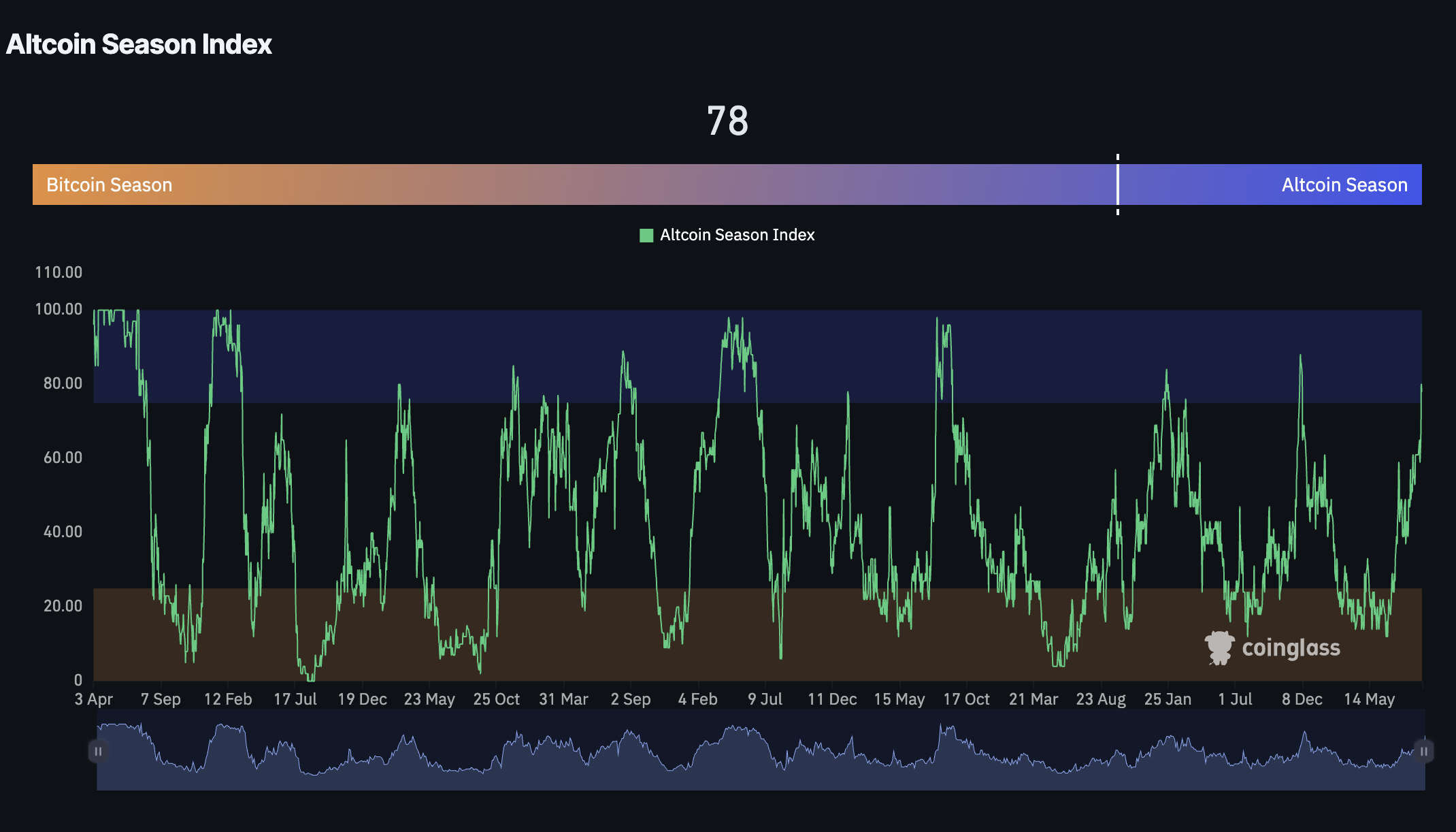 Según CoinGlass, la temporada de altcoins comienza cuando el Índice de Temporada de Altcoins alcanza 75. Según el gráfico a continuación, el índice se sitúa actualmente en 78, lo que sugiere que la temporada de altcoins ha comenzado.