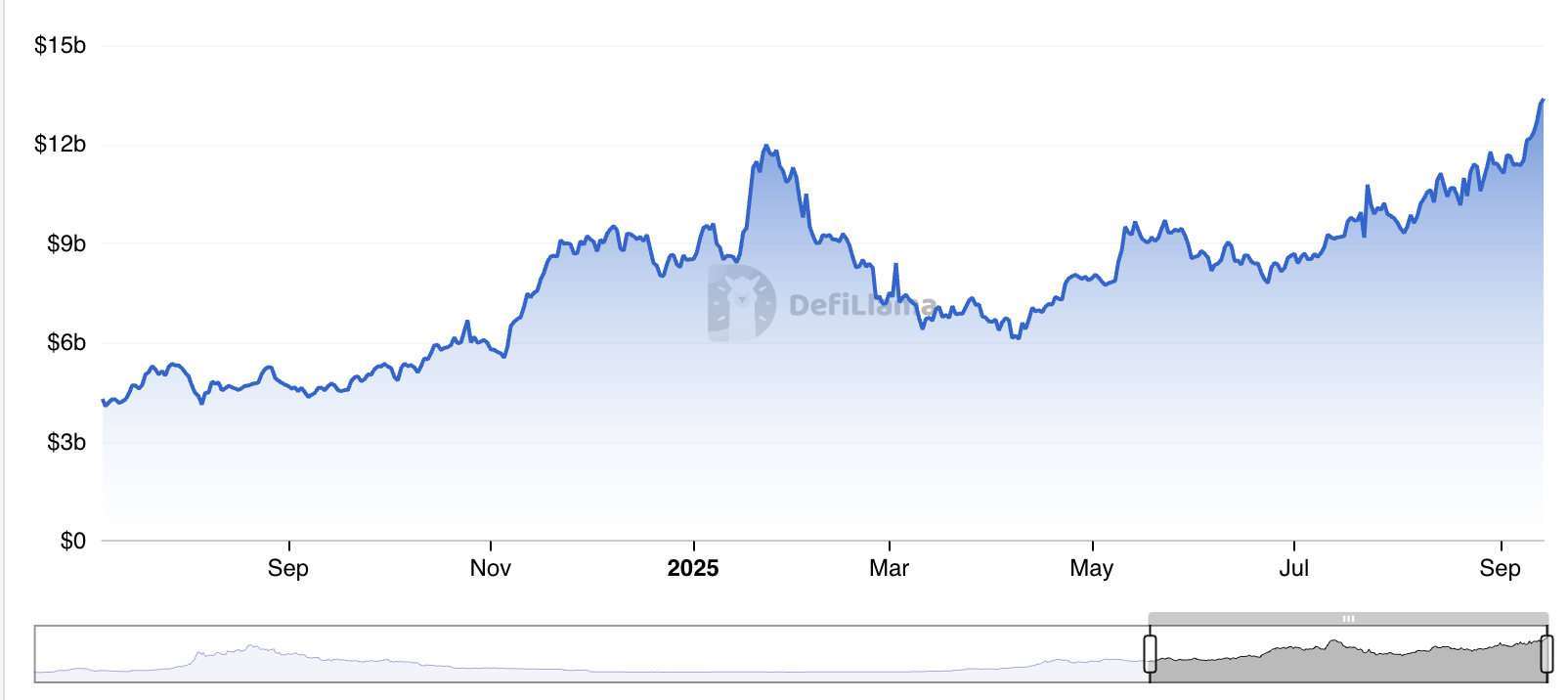 El TVL de Solana alcanzó los 13,38 mil millones de dólares, un incremento del 18% en los últimos siete días. Este aumento refleja mayores entradas de capital hacia los protocolos DeFi de la red, una señal clara de confianza institucional y minorista.