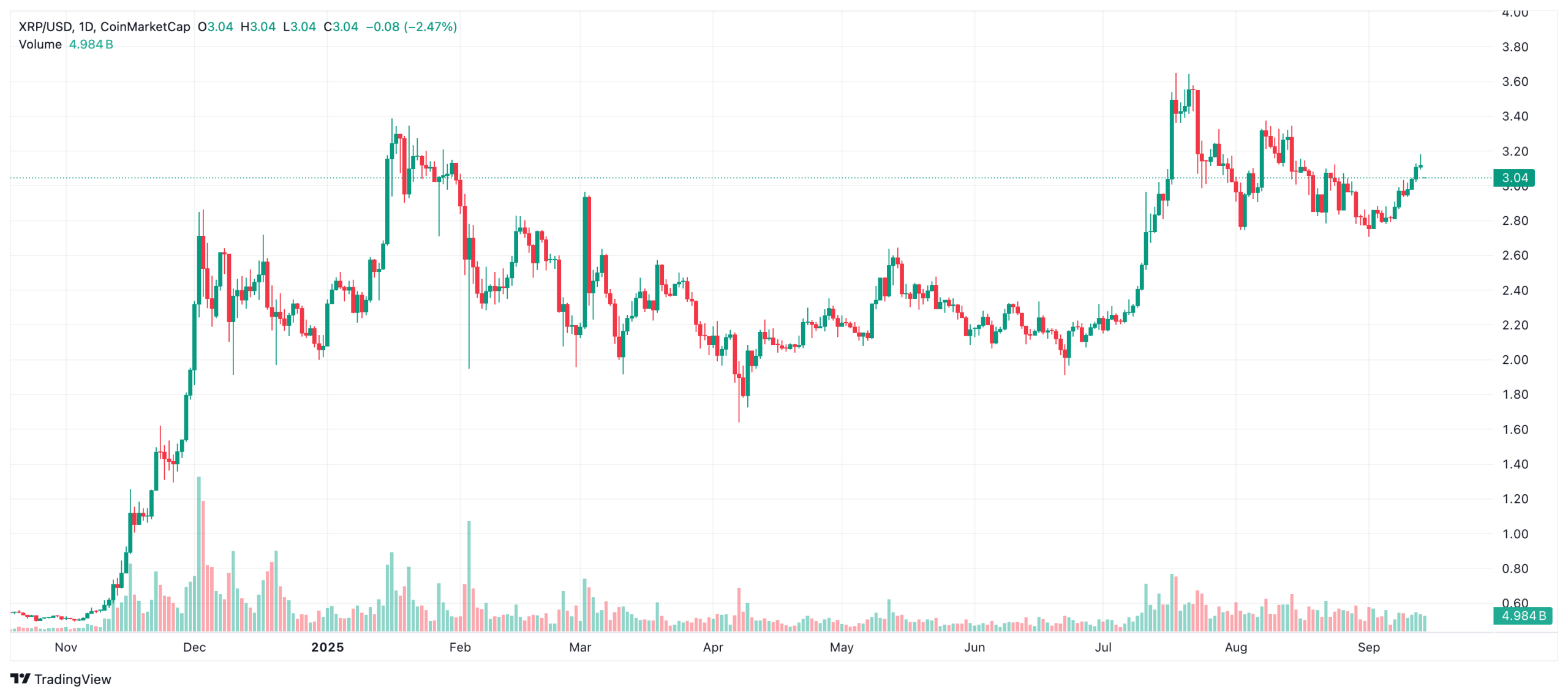 Según CoinMarketCap, XRP se está negociando actualmente a $3.04, experimentando una caída del 4.05% en las últimas 24 horas. Influenciado por el efecto del fin de semana, el volumen de negociación del altcoin cayó un 23.26% a $4.98 mil millones durante el mismo período.