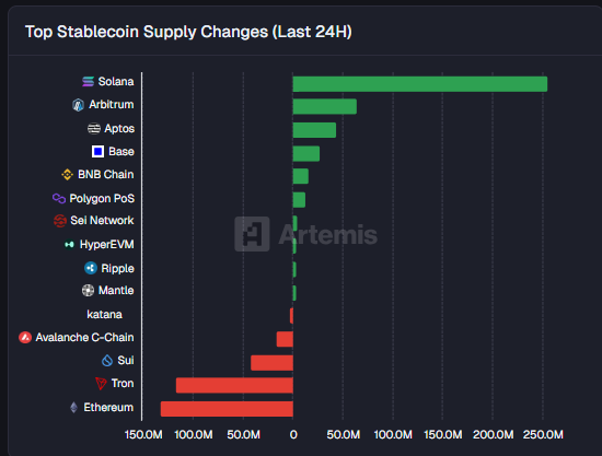Los datos de Artemis Terminal sugieren aún más un panorama alcista, ya que la oferta de stablecoins en la red aumentó en más de 255 millones de dólares en las últimas 24 horas, el mayor aumento entre las principales blockchains. SOL superó a rivales como Arbitrum (ARB) y Aptos (APT), subrayando la creciente demanda y el fortalecimiento del crecimiento del ecosistema.