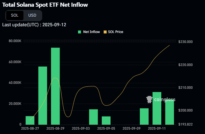 Observando los fondos cotizados en bolsa (ETFs) de Solana, el Rex-Osprey SOL + Staking ETF (SSK) registró una entrada de 15.90 millones de dólares la semana pasada, apoyando la visión alcista.