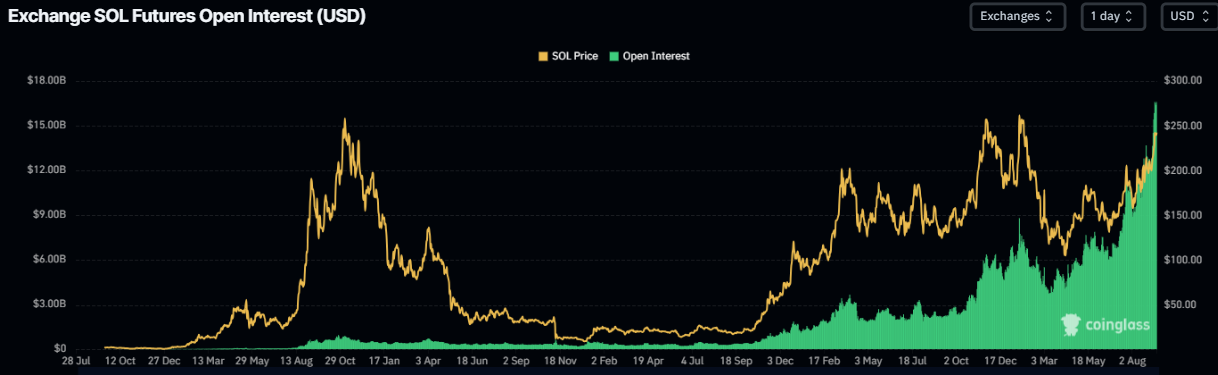 En el frente de los derivados, Solana continúa fortaleciéndose. Los datos de CoinGlass a continuación muestran que el Interés Abierto (OI) de futuros en Solana en los intercambios alcanzó un nuevo máximo histórico de 16.58 mil millones de dólares el lunes. Un OI en aumento representa dinero nuevo o adicional ingresando al mercado y nuevas compras, lo que podría alimentar el actual rally del precio de Solana.
