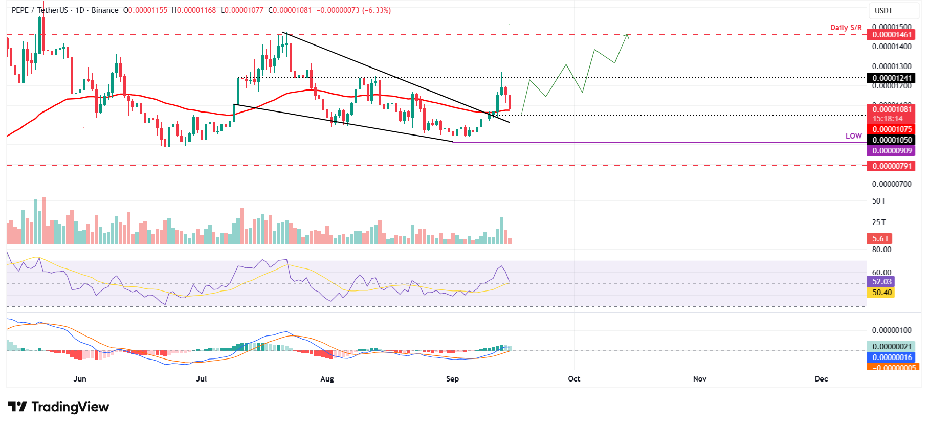 Sin embargo, si PEPE cierra por debajo del soporte diario en 0.0000105$, podría extender la caída hacia su mínimo del 1 de septiembre en 0.0000090$.