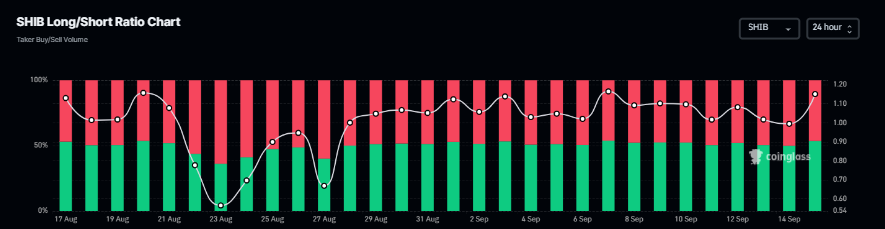El ratio largo-corto de Coinglass para SHIB marcó 1.11 el lunes, el nivel más alto en más de un mes. Este ratio, por encima de uno, refleja un sentimiento alcista en los mercados, ya que más operadores están apostando a que el precio de SHIB suba.