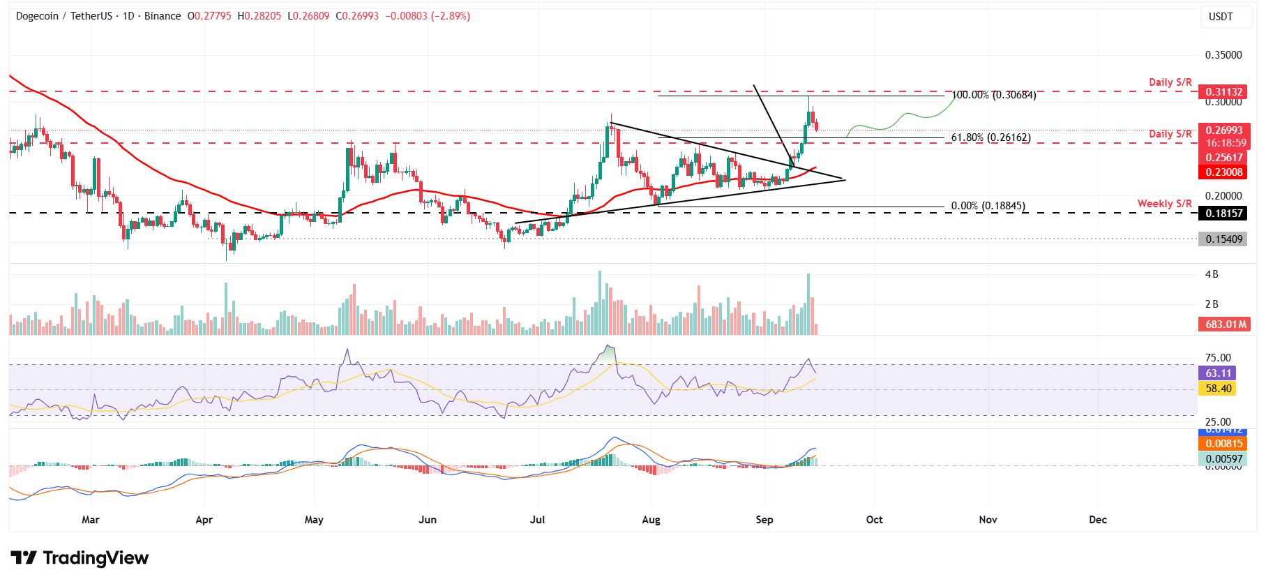El precio de Dogecoin rompió por encima del patrón de triángulo simétrico el 8 de septiembre (formado al conectar múltiples máximos y mínimos con dos líneas de tendencia desde mediados de julio), y subió un 20% en los siguientes cinco días. Sin embargo, DOGE corrigió casi un 4% el domingo. En el momento de escribir el lunes, se negocia alrededor de 0.269$.