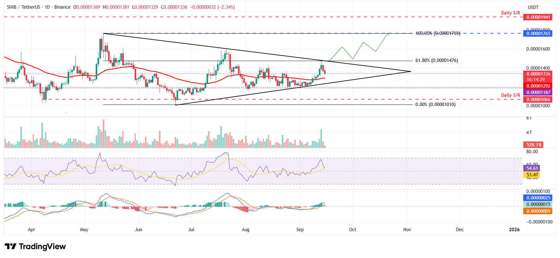 El precio de Shiba Inu cerró por encima de la media móvil exponencial (EMA) de 50 días el 8 de septiembre, encontró soporte alrededor de ella y subió un 12% hasta el sábado. Sin embargo, fue rechazado tras volver a probar la línea de tendencia superior del triángulo simétrico y cayó un 4.27% el domingo. En el momento de escribir el lunes, extiende su caída, cotizando alrededor de 0.0000133$.