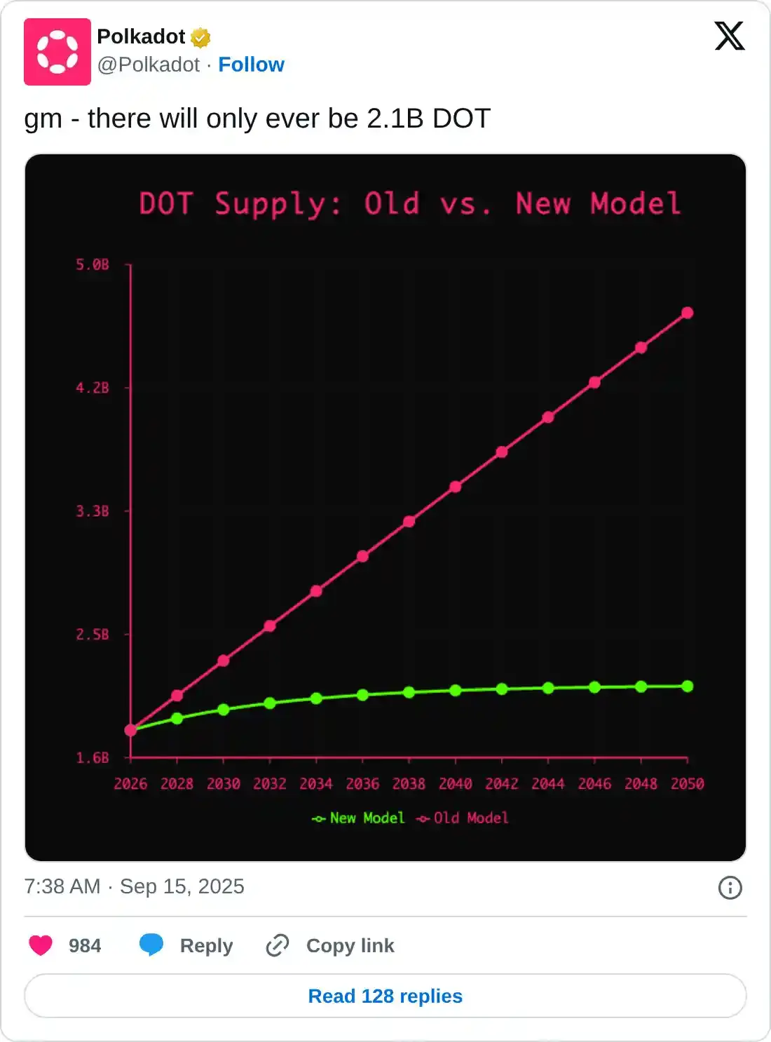 Anteriormente, Polkadot tenía un modelo de suministro infinito, con el suministro total actual promediando 1.522 mil millones de DOT. Con el nuevo modelo, el suministro máximo de Polkadot no superará los 2.1 mil millones de DOT, con nuevas emisiones reduciéndose cada dos años el 14 de marzo (Día de Pi).
