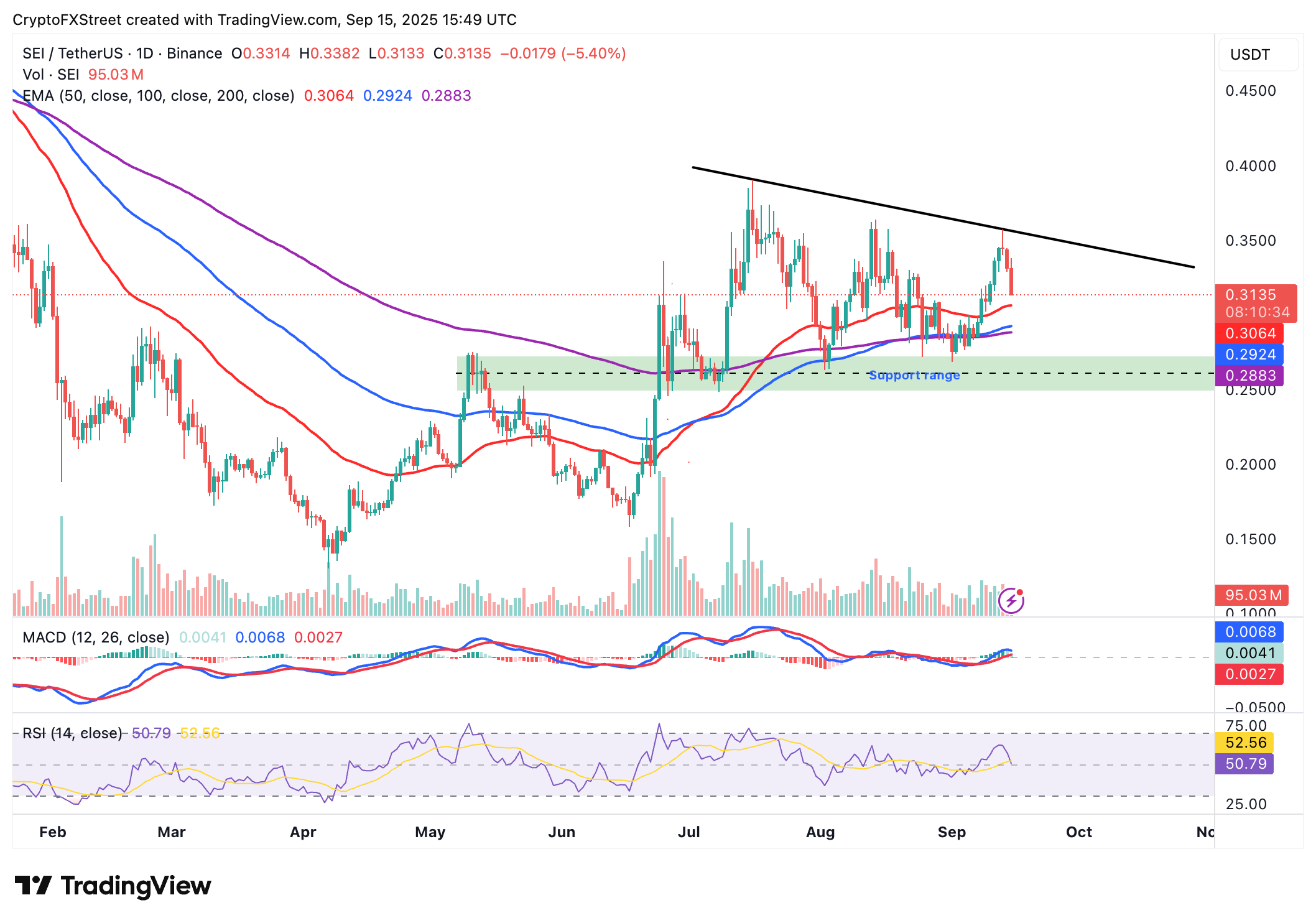 Tras el desbloqueo, el precio de SEI extendió la caída desde un máximo intradía de 0.3382$ hasta 0.3135$. Los indicadores técnicos en el gráfico diario a continuación muestran que Sei está en riesgo de extender la caída.