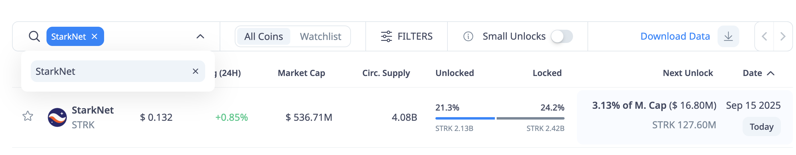 El protocolo Starknet ha liberado 127.6 millones de tokens STRK adicionales, valorados en 16.8 millones de dólares, que se han unido al suministro circulante. Según datos de CryptoRank, este evento de desbloqueo representó el 3.13% de la capitalización de mercado de Starknet de 537 millones de dólares. Con solo el 22.62% del suministro total desbloqueado, los inversores deben prepararse para futuros choques de suministro.