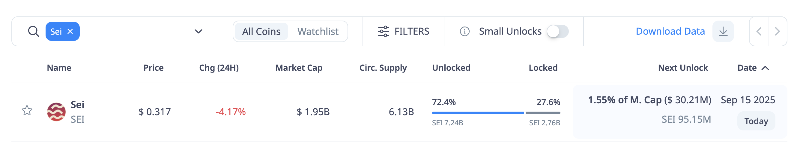 La red Sei ha completado un evento de desbloqueo de tokens, que resultó en la liberación de 95.15 millones de SEI, valorados en aproximadamente 30 millones de dólares. El desbloqueo representa el 1.55% de la capitalización de mercado total de 1.98 mil millones de dólares, según datos de CryptoRank.