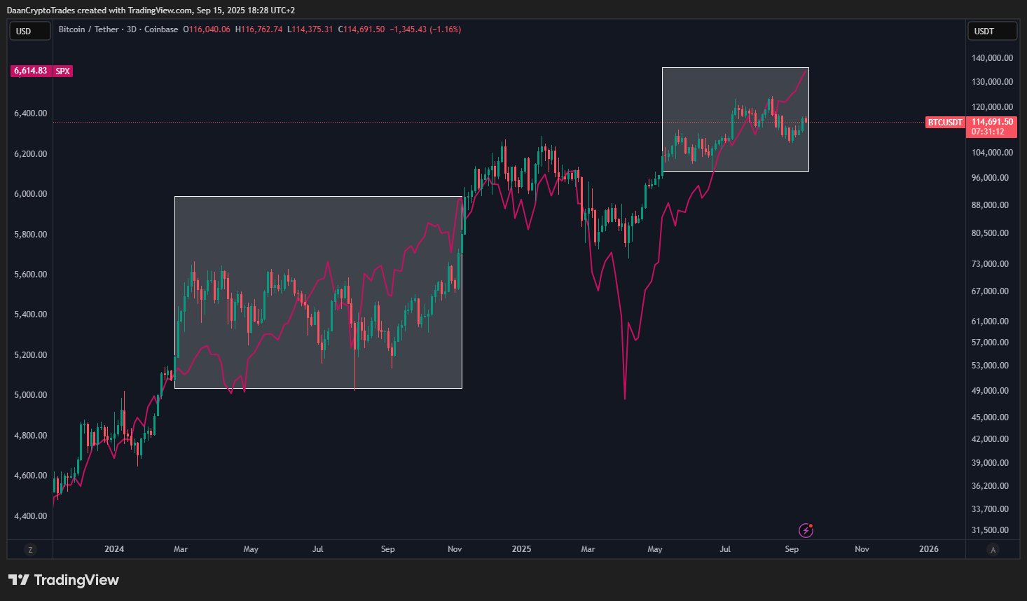 DaanCrypto se enfoca en el movimiento lateral de Bitcoin en medio del florecimiento de las acciones y el oro, advirtiendo a los inversores que esta fase monótona, aunque aparentemente interminable, eventualmente concluirá. Históricamente, Bitcoin tiende a remontar de repente después de tendencias laterales prolongadas, a menudo con repuntes explosivos que duran de uno a dos meses en este ciclo.