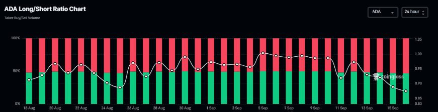 Aparte de esta creciente actividad de toma de beneficios, la relación larga-corta de Coinglass se situó en 0.87 el martes, el nivel más bajo en más de un mes. La relación por debajo de uno indica un sentimiento bajista en el mercado, ya que los operadores están apostando a que los precios de ADA caerán.