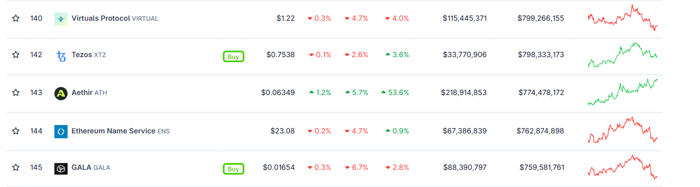 El precio de Aethir comenzó la semana con una nota positiva, repuntando más del 5% el lunes después de haber subido un 100% la semana anterior. Los datos de CoinGecko muestran que la capitalización de mercado de Aethir alcanzó los 774.47 millones de dólares el martes, superando a otras monedas meme populares, como el Servicio de Nombres de Ethereum (ENS) y GALA (GALA), y actualmente ocupando la posición 143 en la tabla de capitalización de mercado de criptomonedas en general.