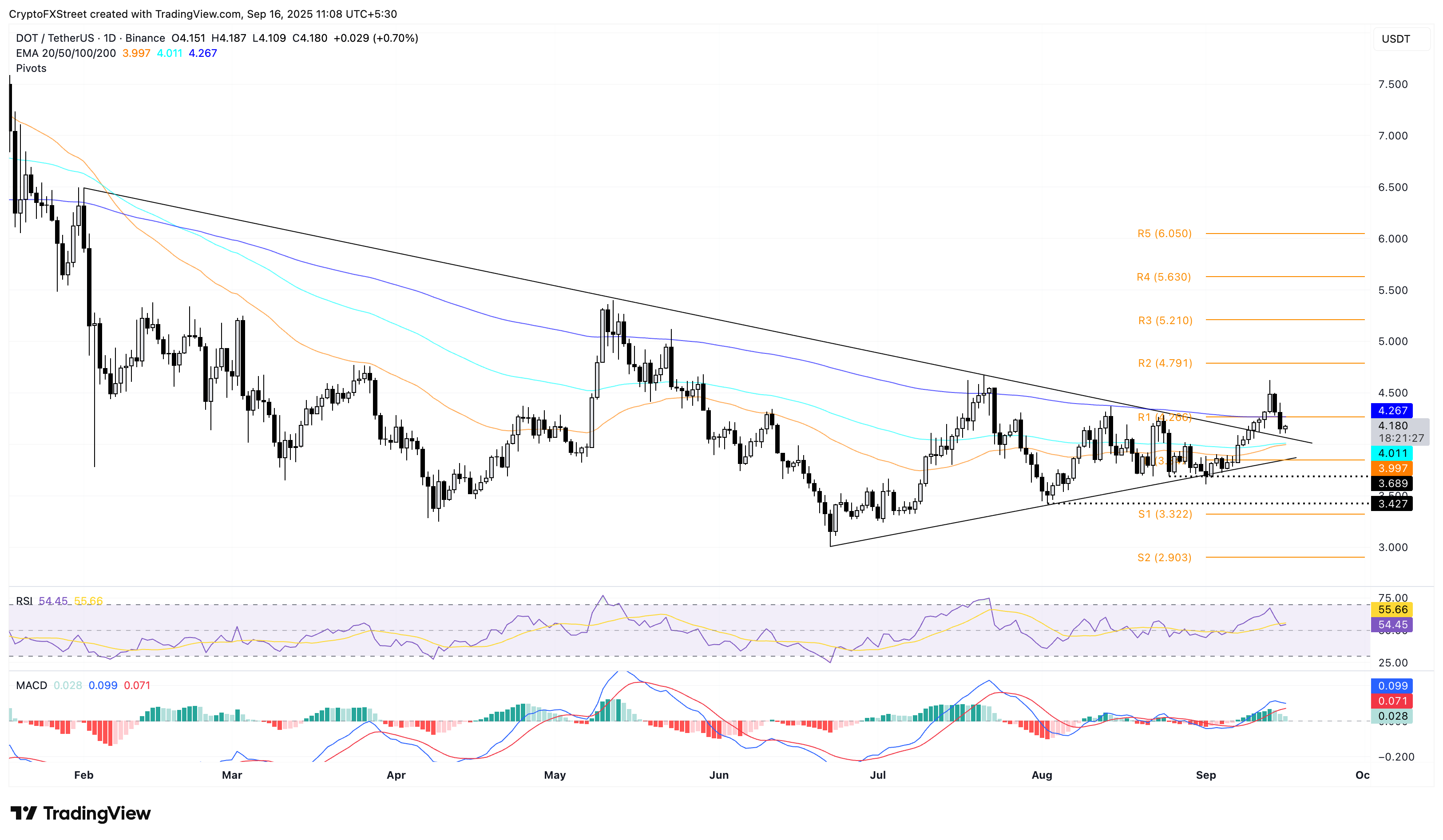 A pesar del esfuerzo activo del ecosistema de Polkadot por cambiar su tokenómica, DOT reaccionó negativamente, resultando en los dos días consecutivos de pérdidas anteriores. En el momento de la redacción, DOT sube casi un 1%, manteniéndose por encima de la línea de tendencia rota de un patrón de triángulo simétrico en el gráfico diario.