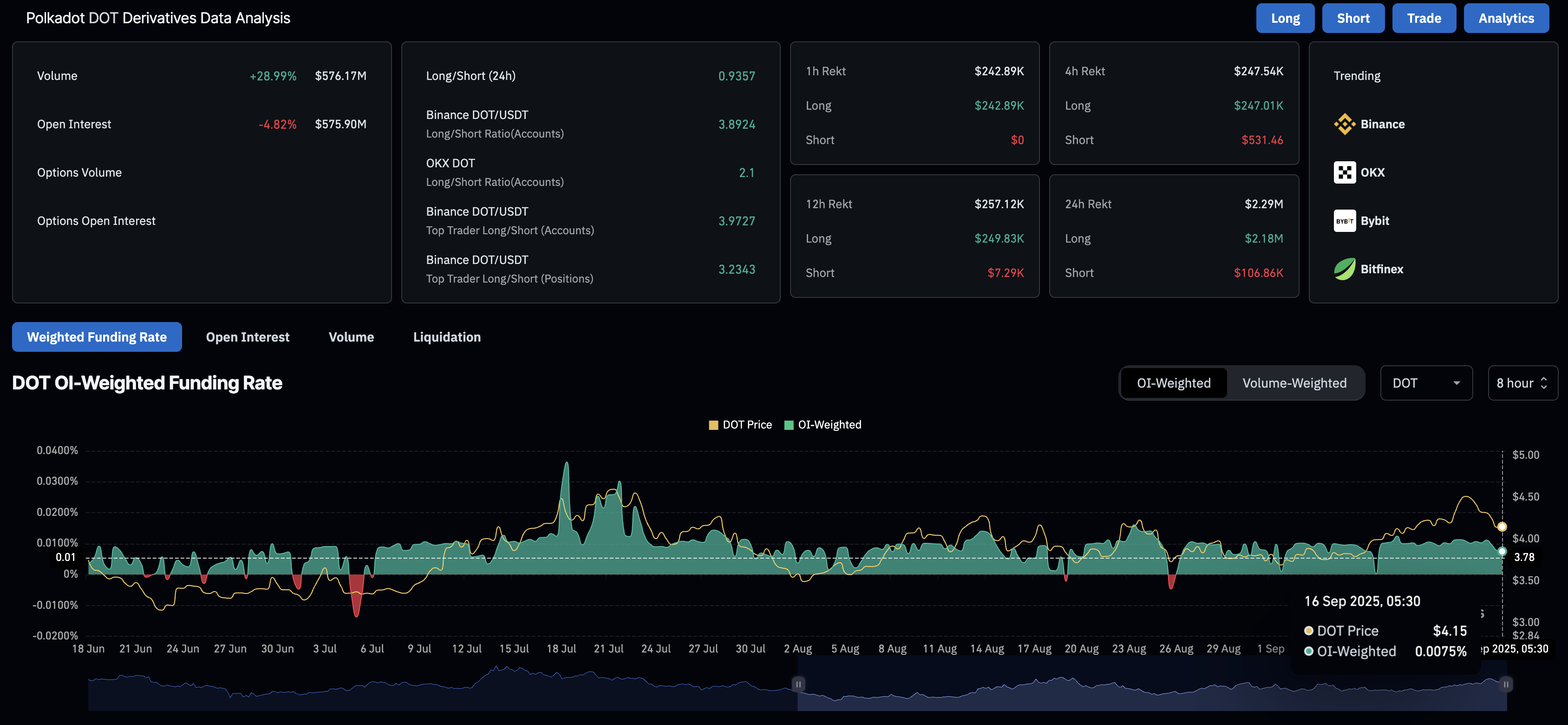 Los datos de CoinGlass muestran que el interés abierto de DOT ha disminuido casi un 5% en las últimas 24 horas, alcanzando los 575.9 millones de dólares. Esto indica una gran salida de derivados de Polkadot a medida que los operadores pierden interés.