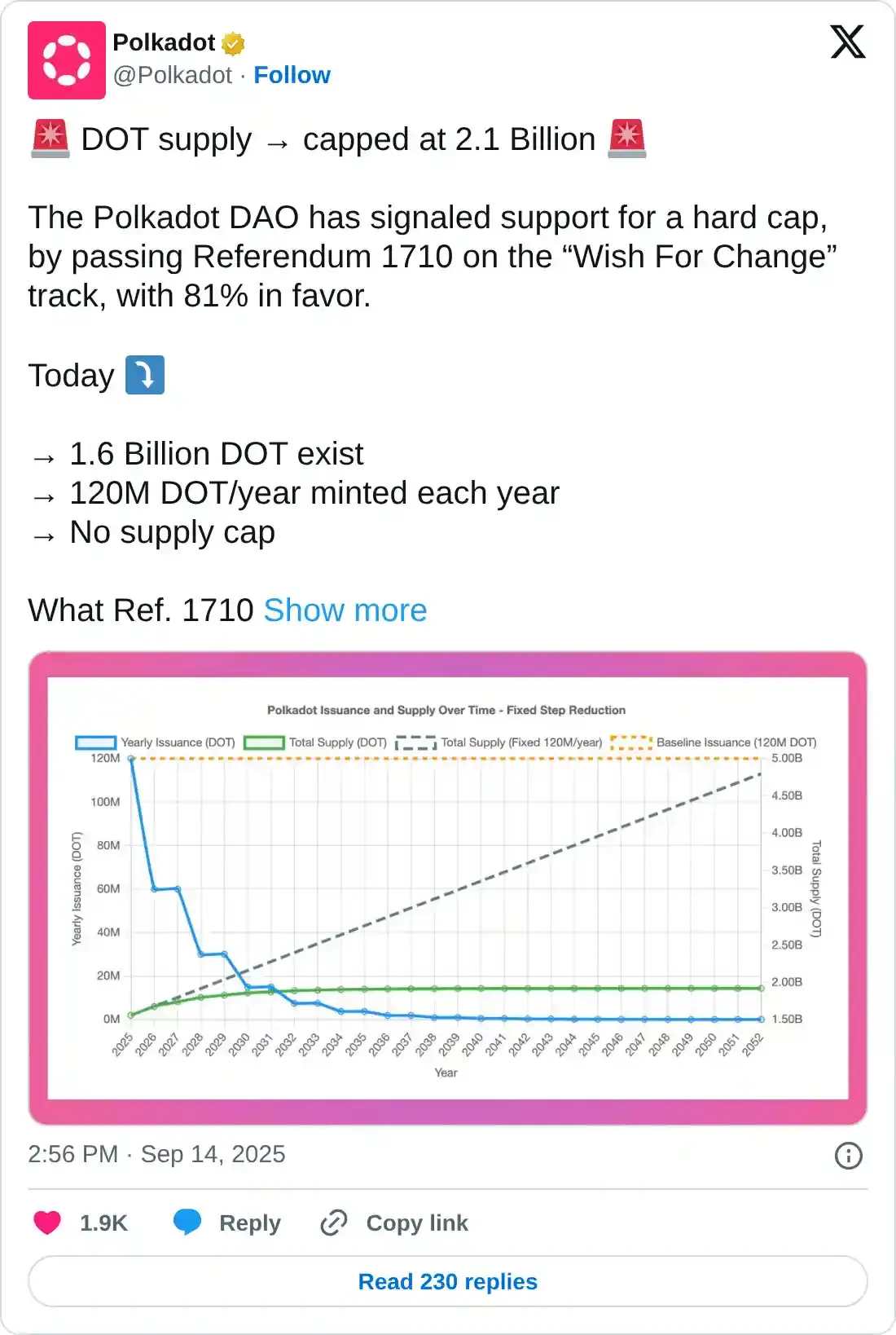 El referéndum también introduce una característica de reducción en la emisión de tokens DOT cada 2 años en el Día de Pi (14 de marzo), lo que reducirá los actuales 120 millones de DOT emitidos anualmente y alcanzará una oferta de 1.91 mil millones de tokens para 2040.