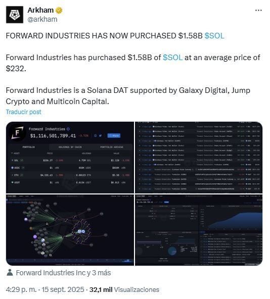 Forward Industries anunció su estrategia de tesorería de Solana el 8 de septiembre, respaldada por gigantes como Galaxy Digital, Jump Crypto y Multicoin Capital.
