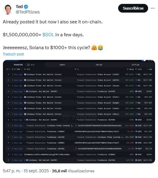 Ante la rápida acumulación de SOL, el destacado analista Ted Pillows predice que el precio de Solana podría alcanzar los 1.000 dólares en este ciclo alcista.