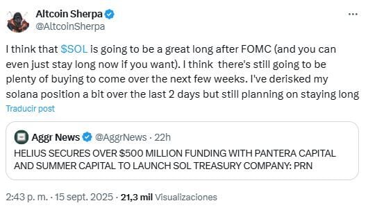 El destacado analista Altcoin Sherpa afirma que Solana será una de las mejores altcoins para comprar durante el repunte de criptomonedas posterior al FOMC, citando el creciente número de firmas de tesorería de SOL.