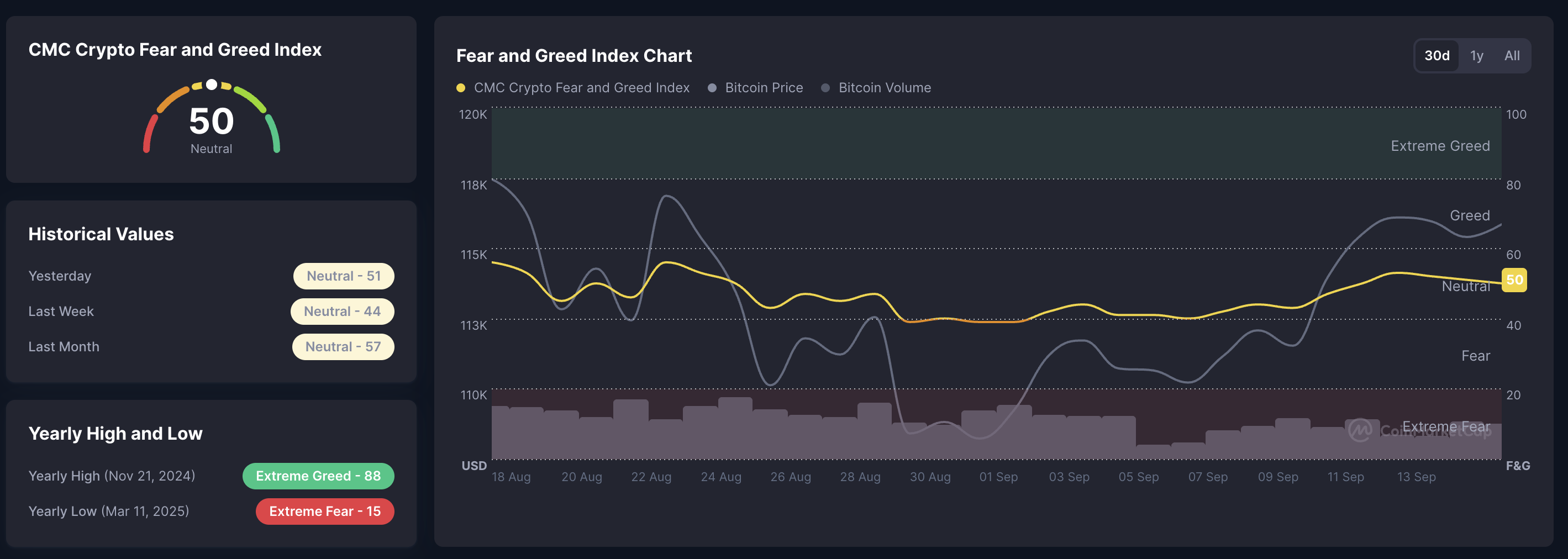 El sentimiento más amplio del mercado de criptomonedas se mantiene estable, anticipando un posible recorte de tasas de 25 puntos básicos en la reunión del FOMC de EE.UU. el miércoles. El Índice de Miedo y Codicia Cripto de CoinMarketCap en 50 permanece neutral, sugiriendo que los inversores están adoptando un enfoque de espera y ver. Tal período de quietud en la actividad del mercado pone a Pi Network en riesgo de perder impulso alcista.