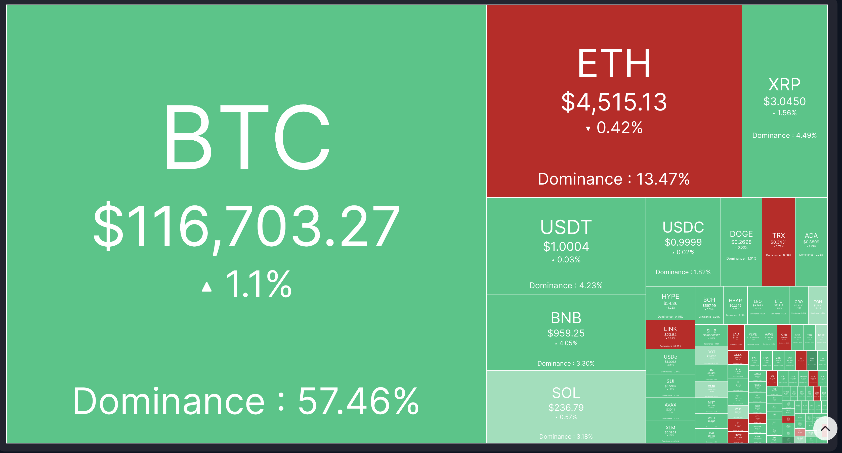 Mapa de calor del mercado de criptomonedas. Fuente: CoinMarketCap