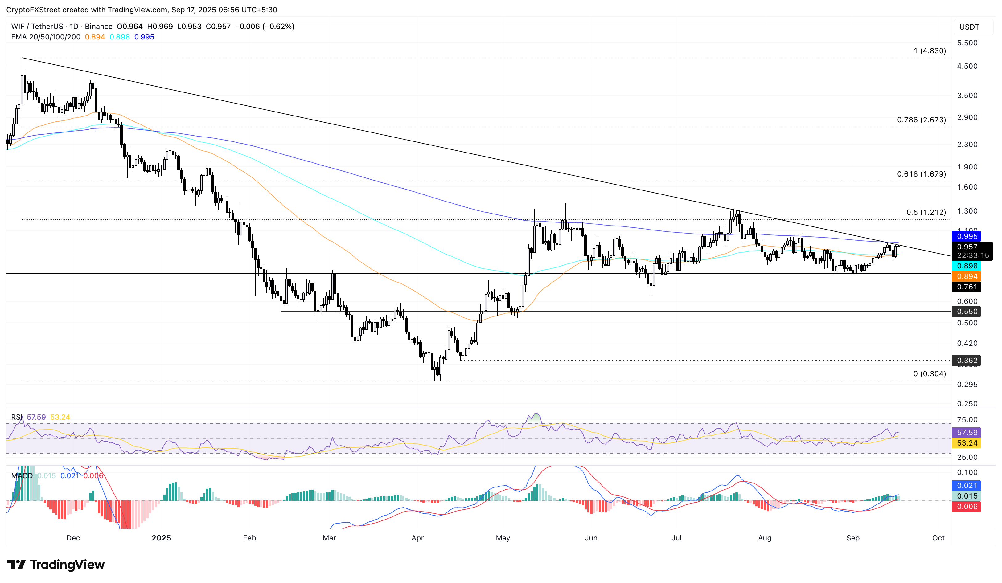 Dogwifhat baja menos del 1% al momento de la publicación el miércoles, desde una línea de tendencia de resistencia clave formada al conectar los picos del 13 de noviembre de 2024 y del 21 de julio de 2025 en el gráfico diario. La EMA de 200 días en 0.995$ se acerca a esta línea de tendencia de resistencia, añadiendo otro obstáculo a la posible tendencia alcista.