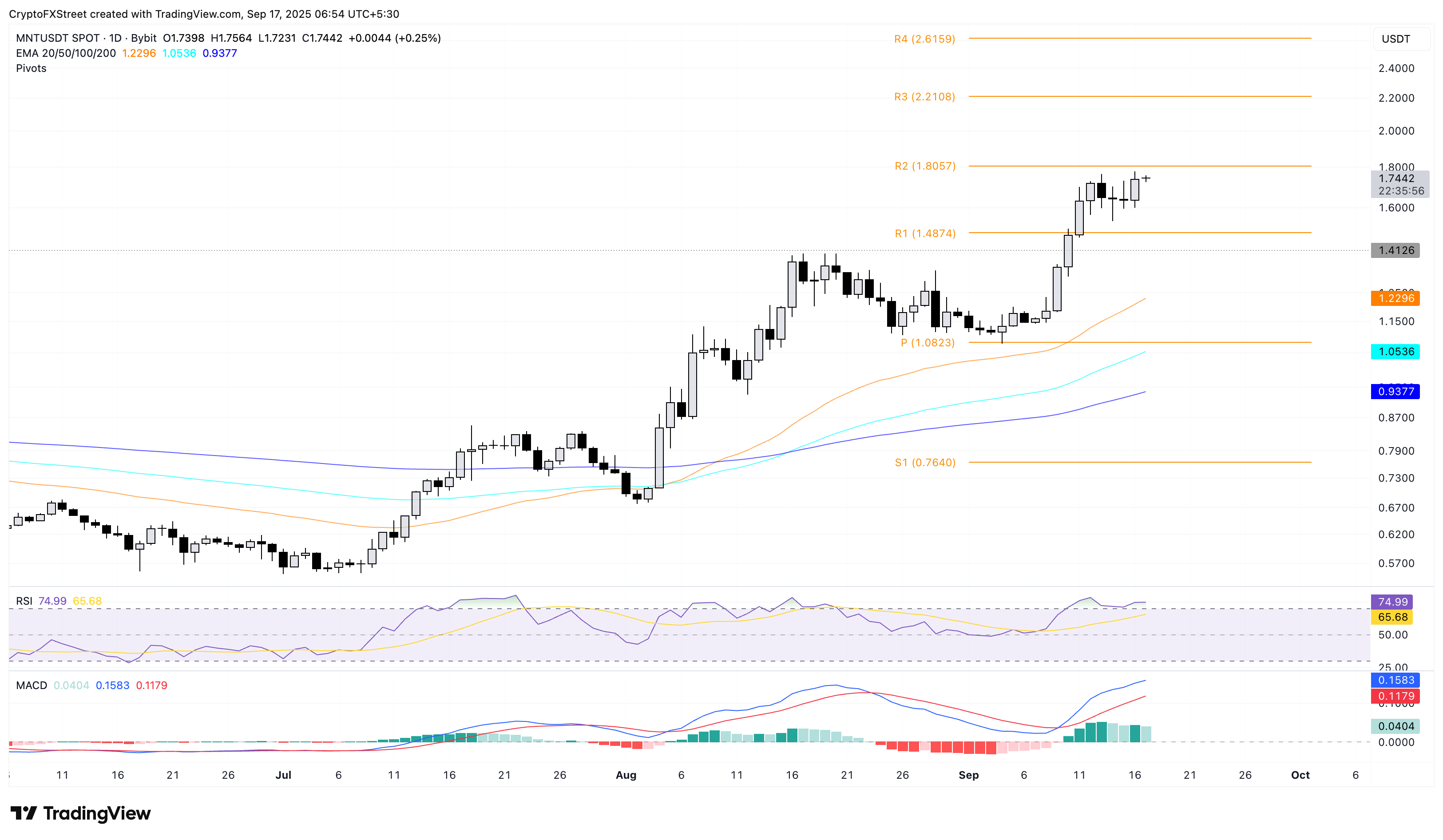 Mantle cotiza cerca de 1.70$ al momento de escribir el miércoles, retrocediendo desde el máximo histórico de 1.77$ del día anterior. MNT tiene como objetivo el nivel de pivote R2 en 1.80$ como la resistencia inmediata.