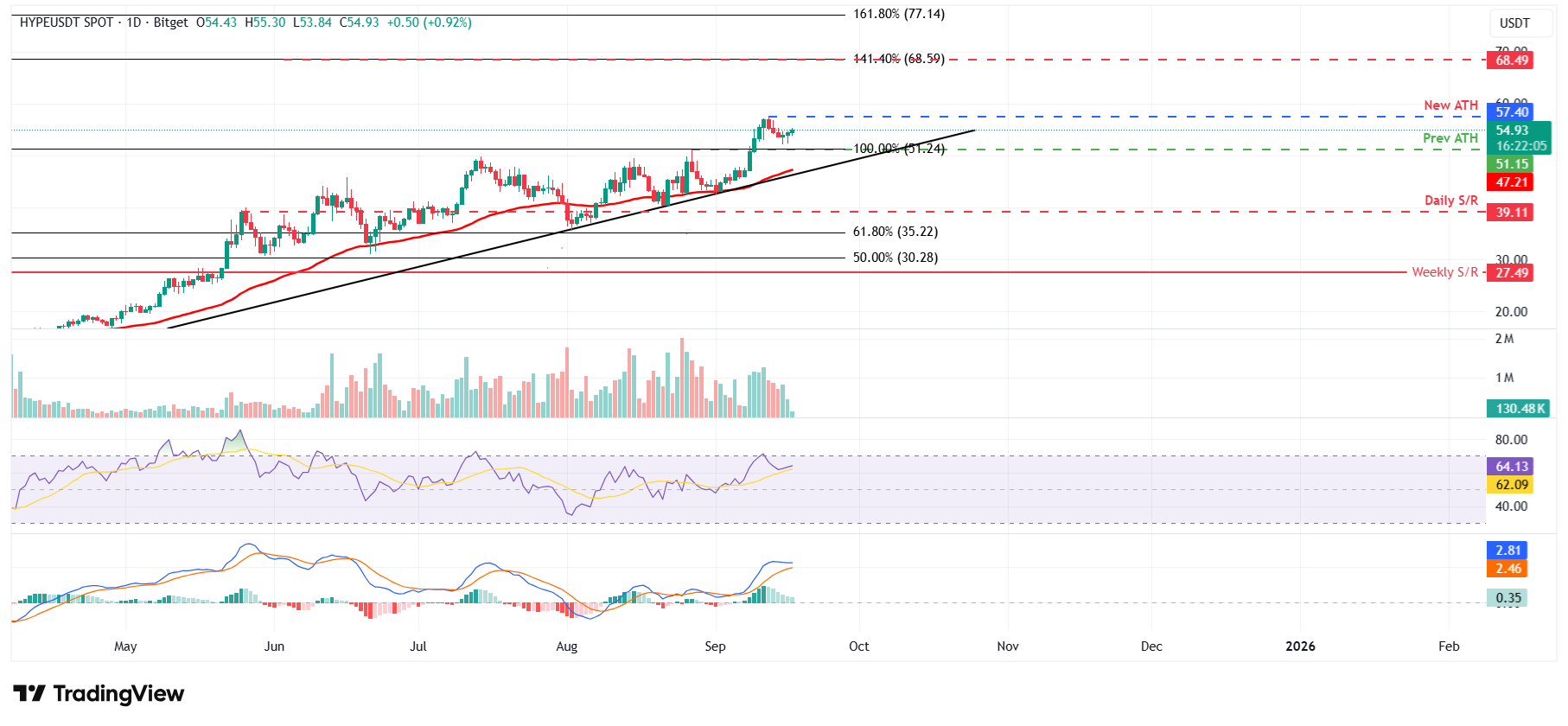 El precio de Hyperliquid alcanzó un nuevo máximo histórico de 57,40$ el viernes, pero no logró mantener el impulso alcista, cayendo un 5,81% para el domingo. Al inicio de la semana el lunes, HYPE se recuperó ligeramente, cerrando por encima de 54,43$ al día siguiente. En el momento de escribir el miércoles, HYPE continúa su recuperación, cotizando por encima de 54,93$.