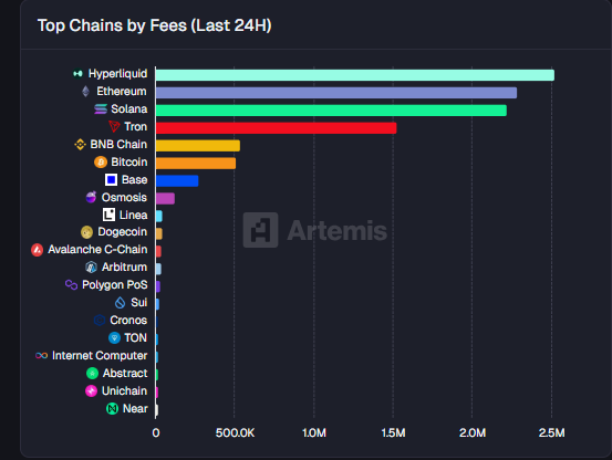 Según los datos de Artemis Terminal, la recolección de tarifas de cadena de 24 horas de Hyperliquid es de 2,5 millones de dólares, liderando la lista de otras redes como Ethereum y Solana, lo que indica un creciente interés entre los comerciantes y liquidez en la cadena HYPE.