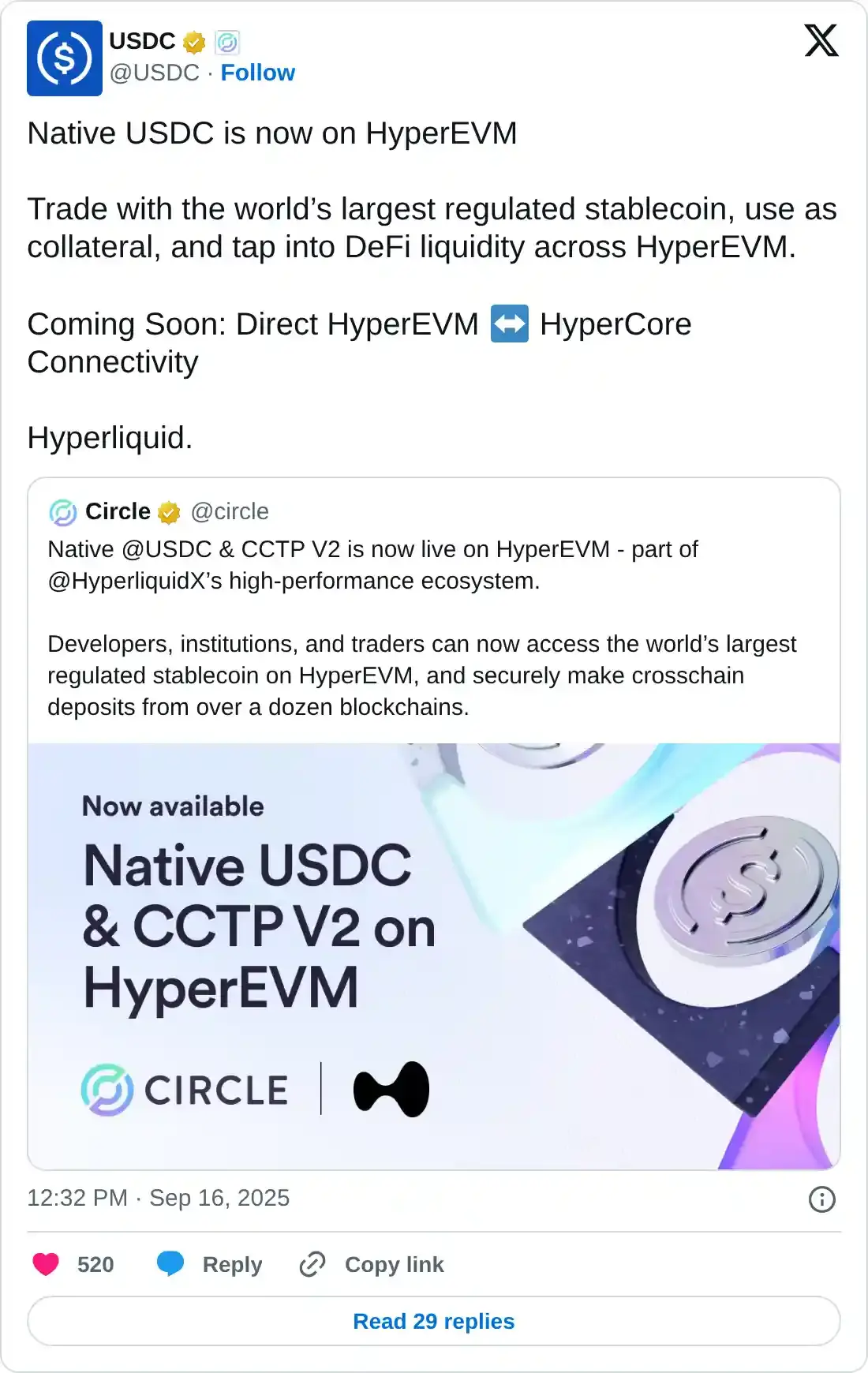 La stablecoin USDC anunció el martes que su USDC nativo y el Protocolo de Transferencia entre Cadenas (CCTP) V2 se desplegarán en la Máquina Virtual de Ethereum (EVM) de Hyperliquid, permitiendo depósitos de USDC en HyperCore y cualquier aplicación HyperEVM, haciendo que los depósitos, el comercio y los casos de uso de Finanzas Descentralizadas (DeFi) sean más fluidos y seguros.