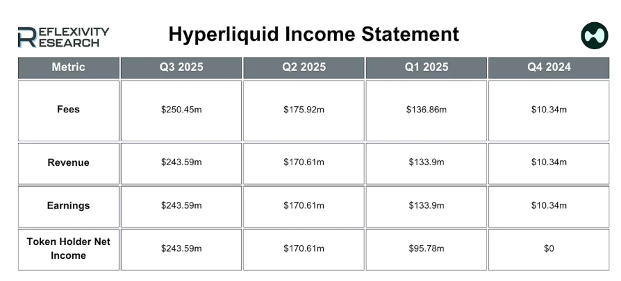 Además, el informe semanal de Reflexividad destacó que en el tercer trimestre, Hyperliquid logró su mejor rendimiento financiero hasta la fecha, con tarifas alcanzando los 250,45 millones de dólares y el ingreso neto de los tenedores de tokens subiendo a 243,59 millones de dólares, todo con un equipo de solo 11 personas.