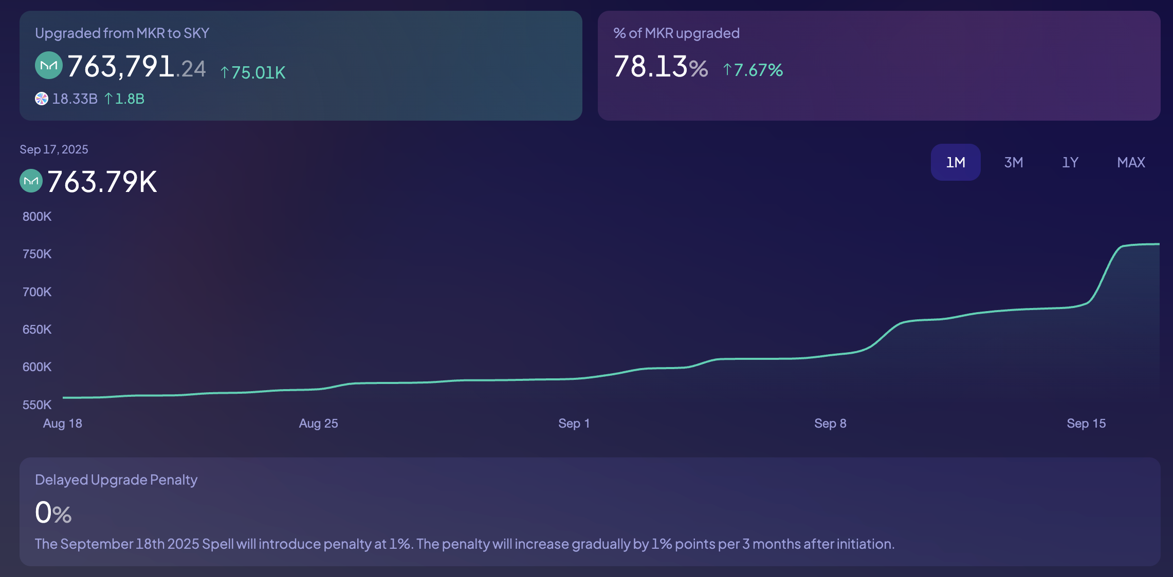 Actualmente, el 78.13% de los tokens MKR han sido actualizados a SKY, lo que representa un aumento del 7.67% en las últimas 24 horas.