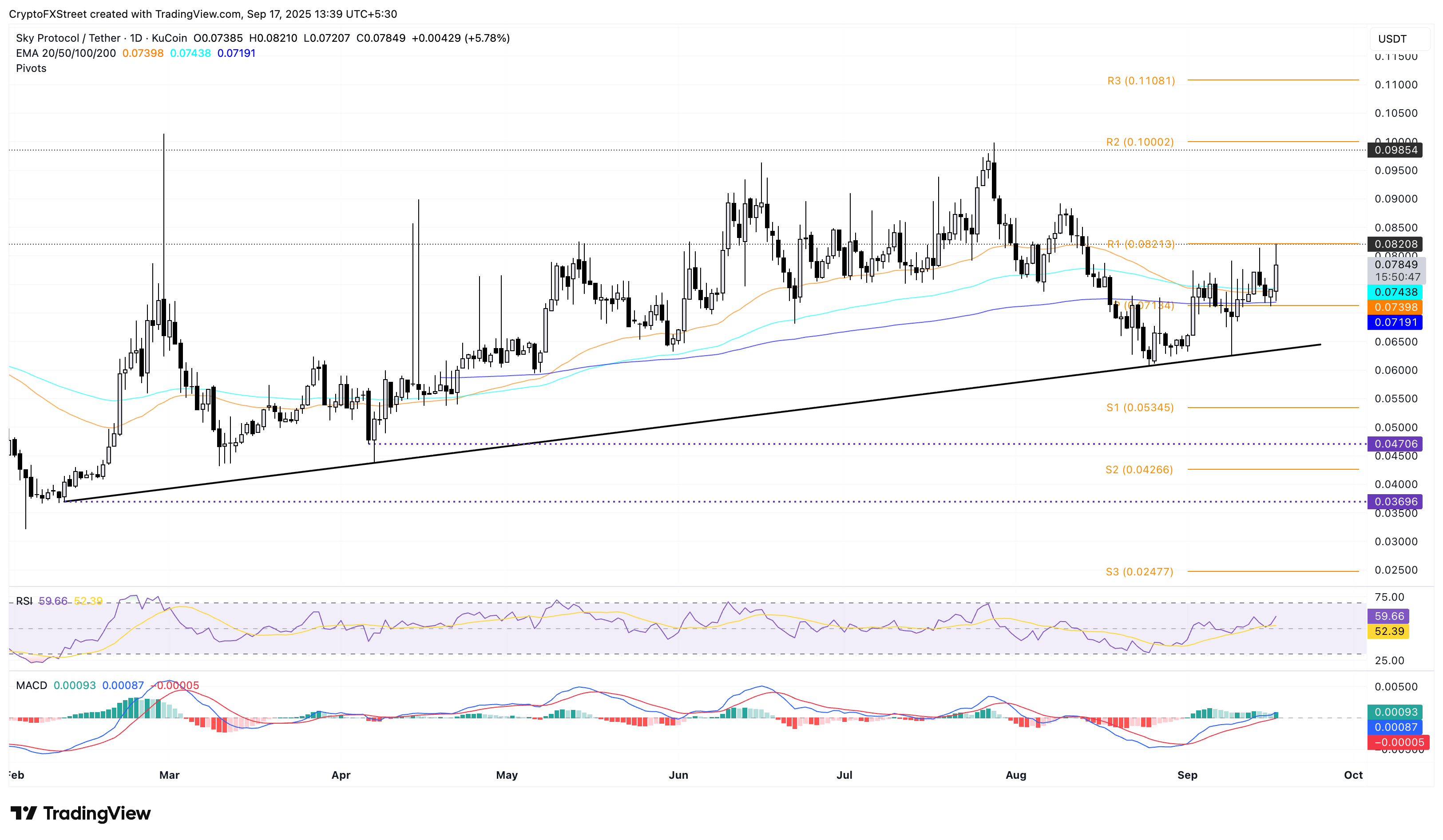 Sky añade más del 5% de ganancias hasta ahora el miércoles, construyendo sobre el aumento del 1.64% del martes. La recuperación a corto plazo desde la EMA de 200 días desafía el nivel de pivote R1 en 0.08213$, que actúa como la resistencia inmediata.