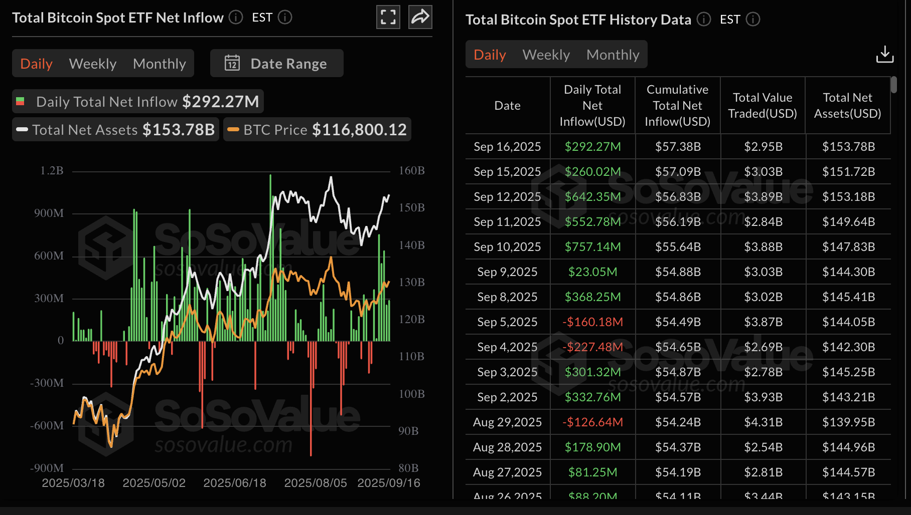 La demanda institucional de Bitcoin a través de ETFs ha aumentado constantemente desde el 8 de septiembre. Los datos de SoSoValue muestran que los ETFs de BTC extendieron la racha de entradas durante siete días consecutivos con aproximadamente 292 millones de dólares netos fluyendo el martes.