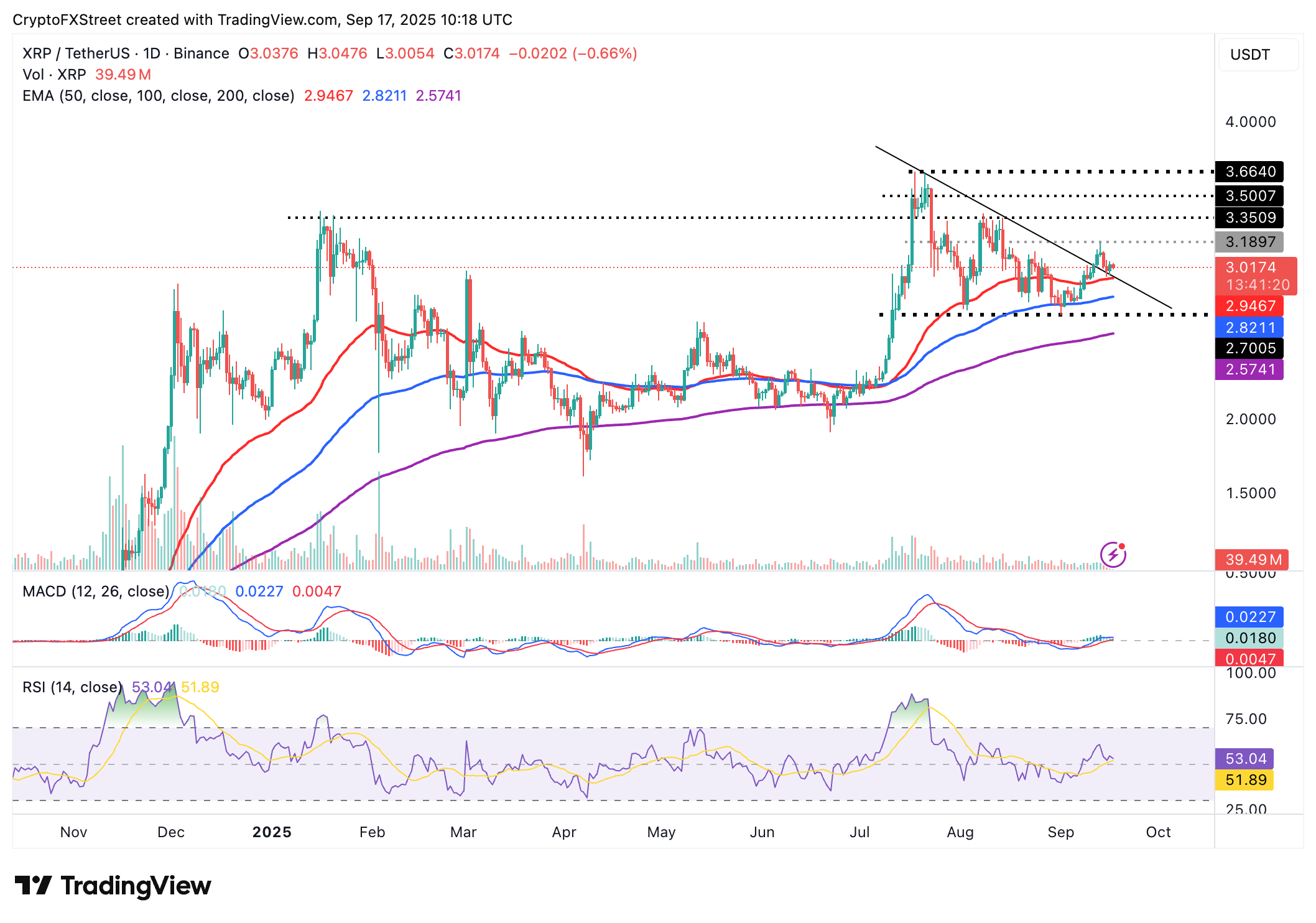 En cuanto al XRP, se mantiene por encima de 3.00$ después de corregir desde el máximo de la semana pasada de 3.18$. El RSI en 53 apunta hacia la línea media, lo que respalda un escenario donde el impulso alcista continúa desvaneciéndose antes de la decisión de tasas de interés de la Fed.