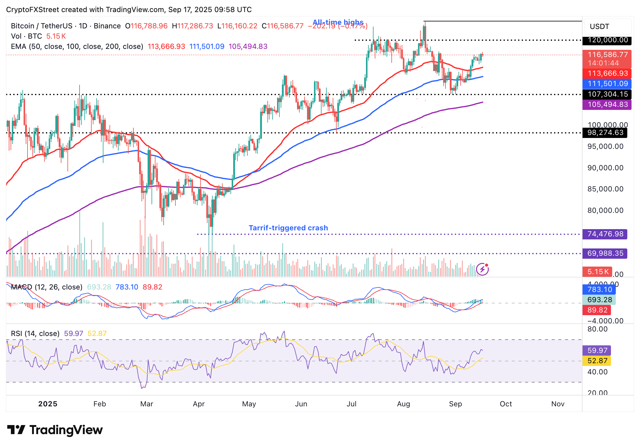 El Bitcoin (BTC) exhibe un sutil potencial alcista, cotizando ligeramente por debajo de 117.000$ en el momento de escribir, después de retroceder desde un máximo intradía de 117.286$. El aumento en el precio se puede atribuir a varios factores, incluyendo entradas constantes de fondos cotizados en bolsa (ETF) en Estados Unidos y un creciente optimismo de que la Reserva Federal (Fed) podría anunciar un recorte de tasas de interés más tarde el miércoles.