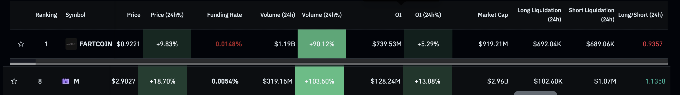 Típicamente, una reducción en las tasas de interés alimenta el apetito de riesgo entre los operadores debido al fácil acceso a la liquidez, lo que podría aumentar la exposición a activos de riesgo como las criptomonedas de alto riesgo, como las monedas meme. Los datos de CoinGlass muestran una tendencia similar, ya que el Interés Abierto (OI) de MemeCore y Fartcoin aumentan un 5% y un 13%, alcanzando 739 millones de dólares y 128 millones de dólares, respectivamente, en las últimas 24 horas. Esta chispa en el OI refleja un aumento en el flujo de capital en el mercado de derivados, a medida que los operadores ganan confianza.