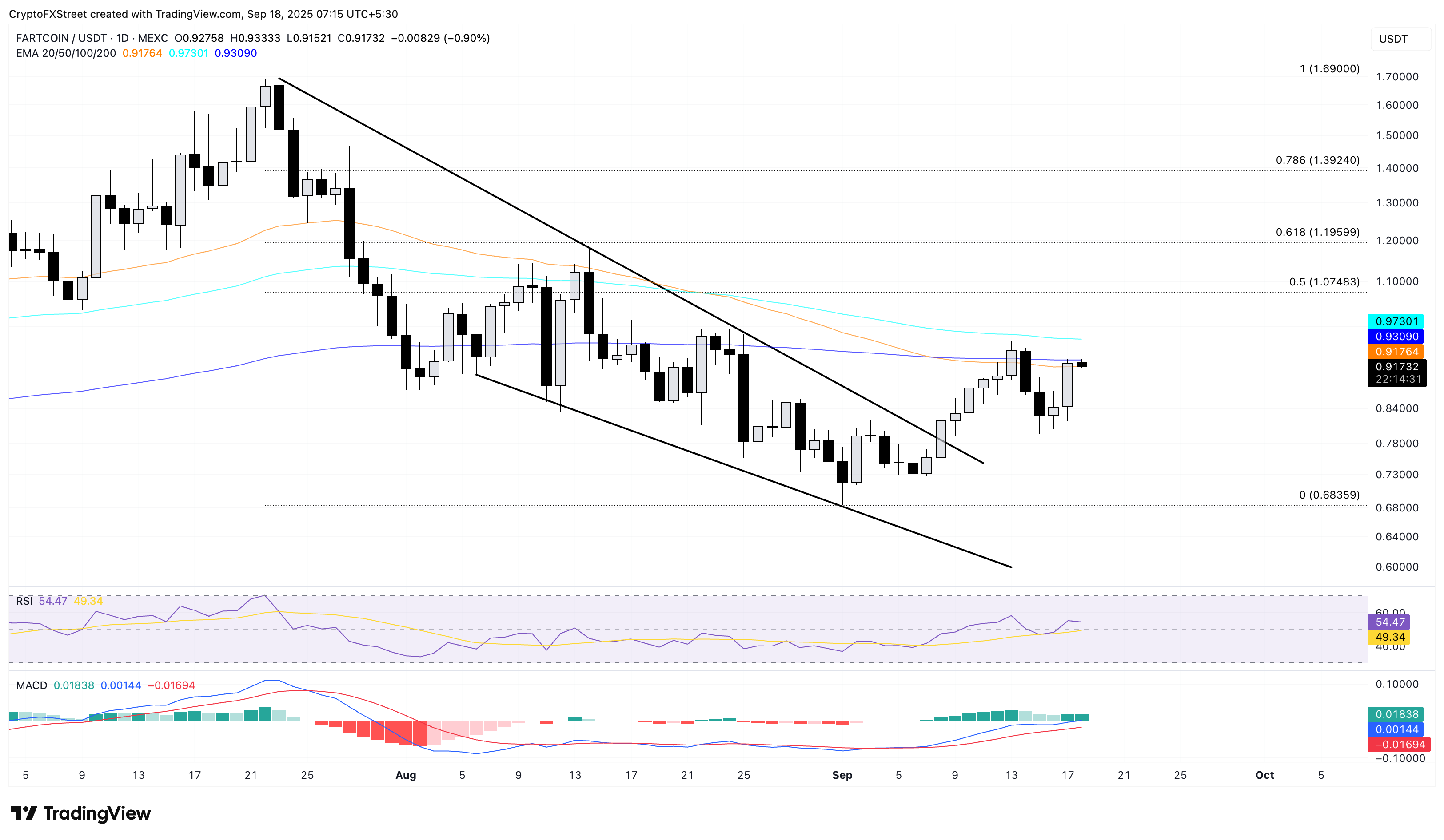 Si Fartcoin supera la EMA de 200 días en 0.9309$, podría extender la recuperación hasta el nivel de retroceso del 50%, que se traza desde el pico del 22 de julio en 1.6900$ hasta el mínimo del 2 de septiembre en 0.6835$, en 1.0748$.