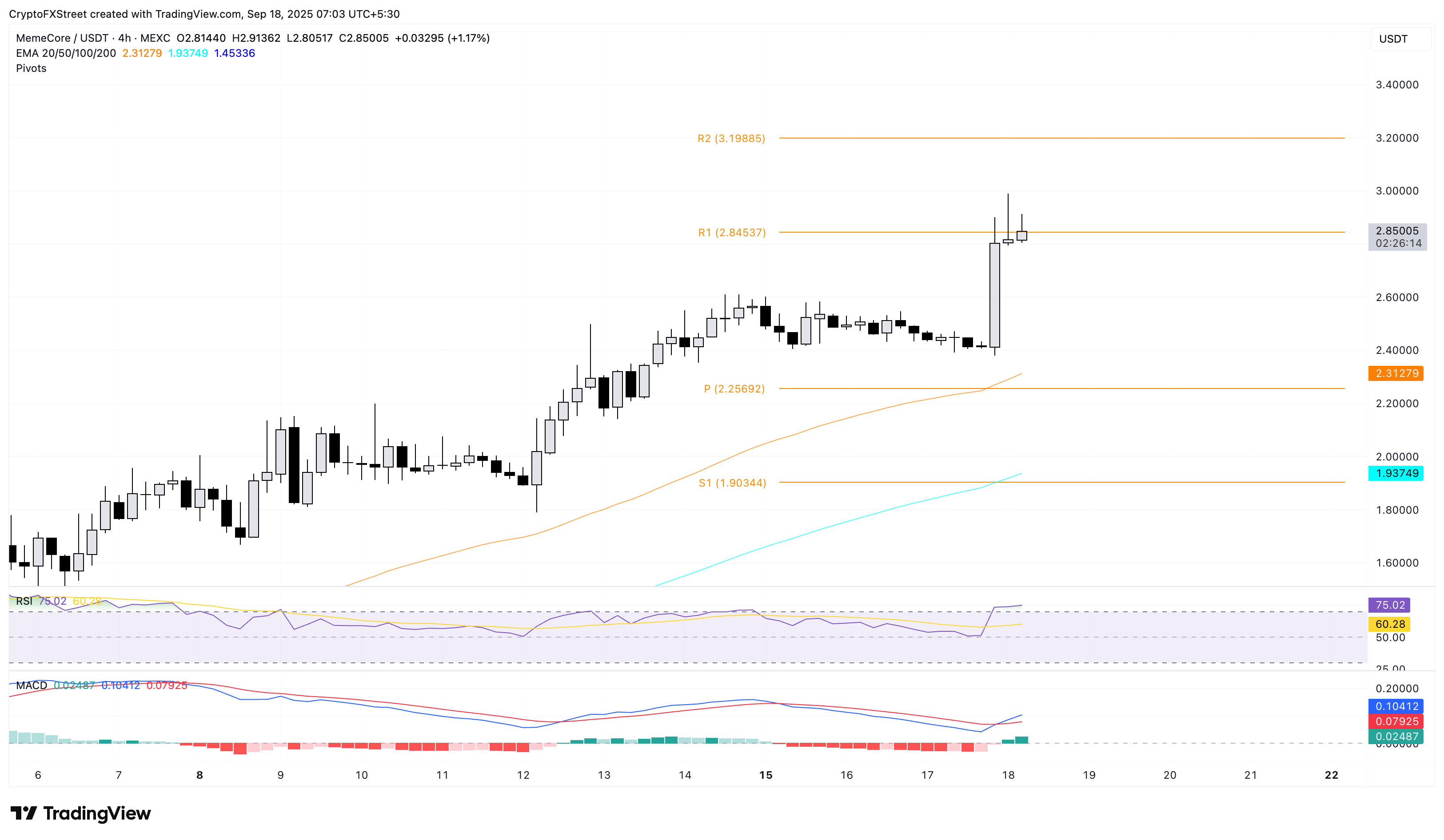 MemeCore avanza un 3% al momento de escribir el jueves, extendiendo el aumento del 15% del miércoles. Los alcistas anticipan que esta moneda meme supere el hito de 3.00$, ya que alcanzó un máximo histórico de 2.99$ el día anterior.