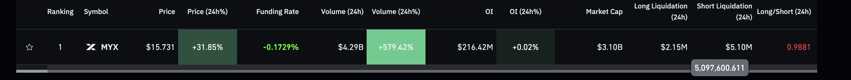 Por otro lado, el OI de MYX Finance se mantiene en 216 millones de dólares, lo que indica que el interés podría haber alcanzado su punto máximo.