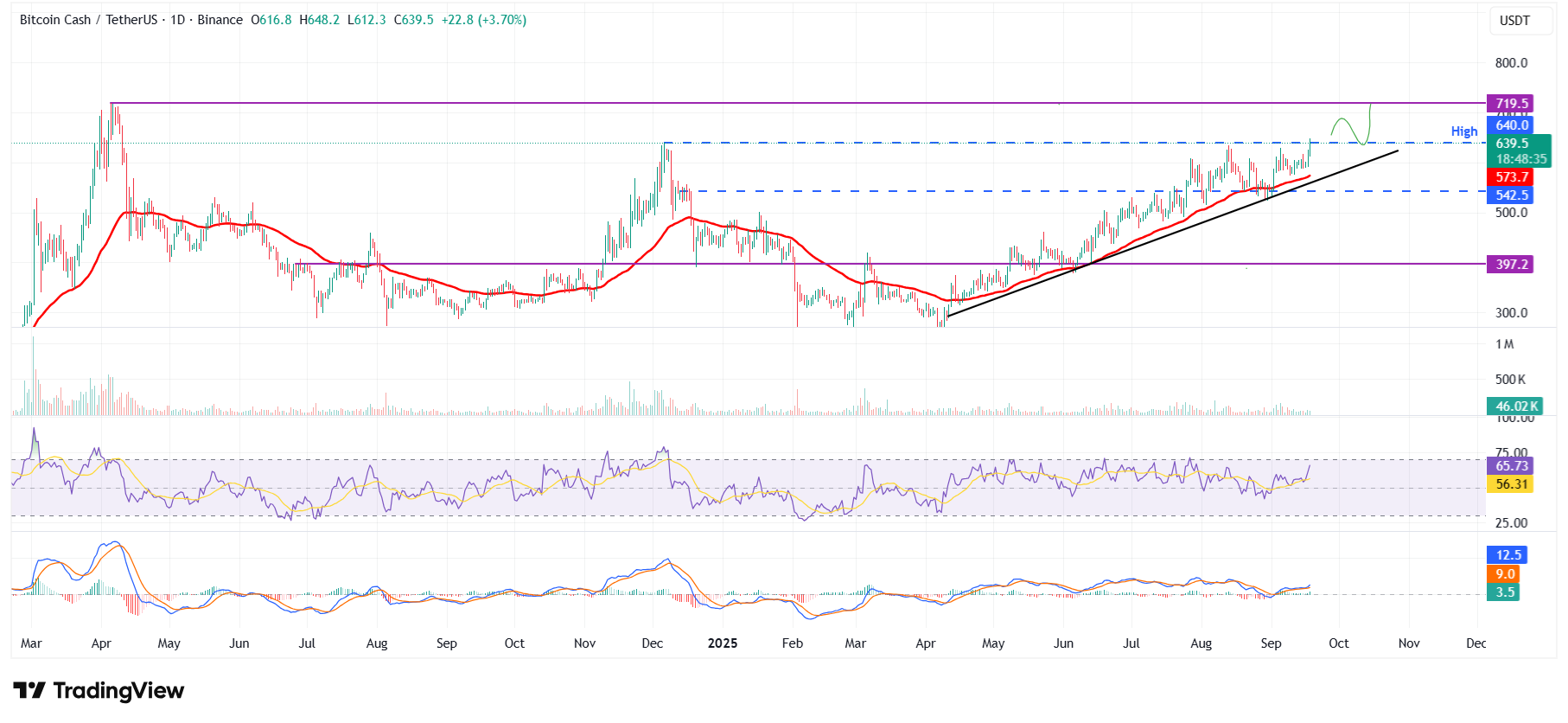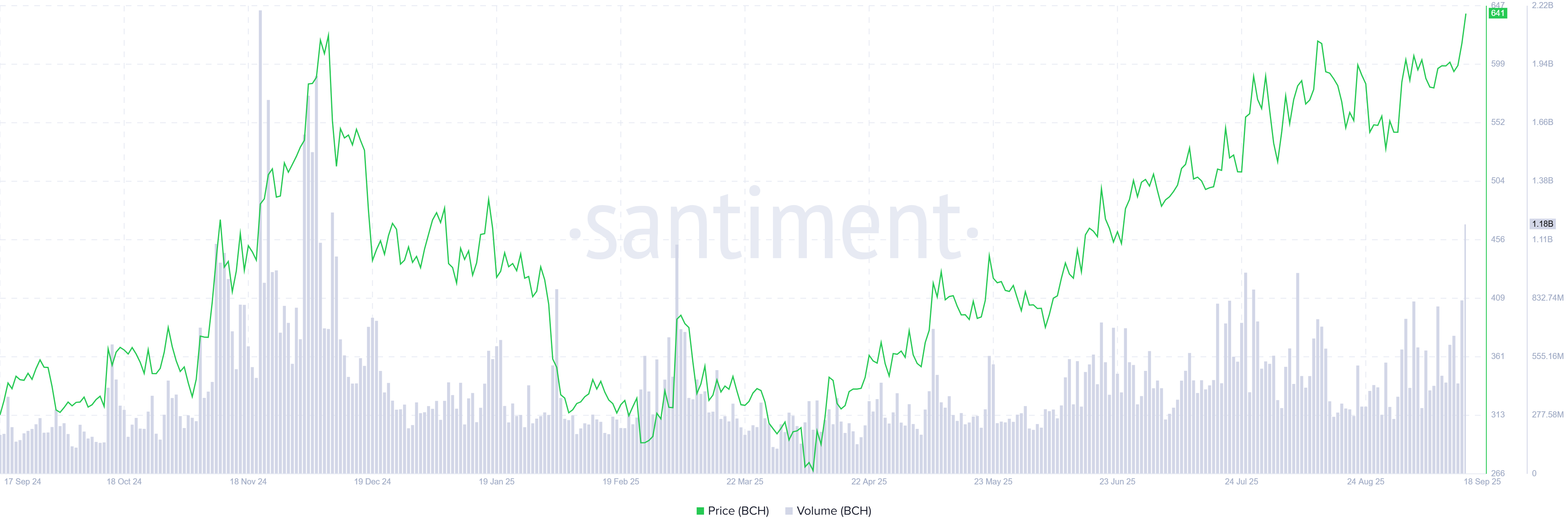 Bitcoin Cash (BCH) se dispara a un nuevo máximo anual de 648.20$ al momento de escribir el jueves, ampliando su impulso alcista tras el recorte de 25 puntos básicos (pbs) de la Reserva Federal de EE.UU. (Fed). Además, la posibilidad de recortes adicionales más adelante este año alimentó aún más el sentimiento de riesgo en el mercado de criptomonedas. Los datos en cadena también respaldan la perspectiva alcista, con volúmenes de comercio alcanzando los niveles más altos desde diciembre de 2024, lo que indica un renovado interés de los inversores en BCH.