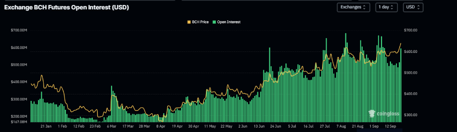El Interés Abierto (OI) de futuros en Bitcoin Cash en los intercambios aumentó de 486.36 millones de dólares el 11 de septiembre a 595.78 millones de dólares el jueves, y ha estado aumentando de manera constante. El aumento del OI representa nuevo o adicional dinero ingresando al mercado y nuevas compras, lo que podría impulsar la actual recuperación del precio de BCH.