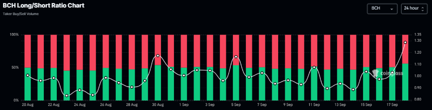 Otra señal alcista es el ratio largo-corto de BCH de Coinglass, que se sitúa en 1.28, el nivel más alto en más de un mes. Este ratio, por encima de uno, refleja un sentimiento alcista en los mercados, ya que más comerciantes están apostando a que el precio del activo suba.
