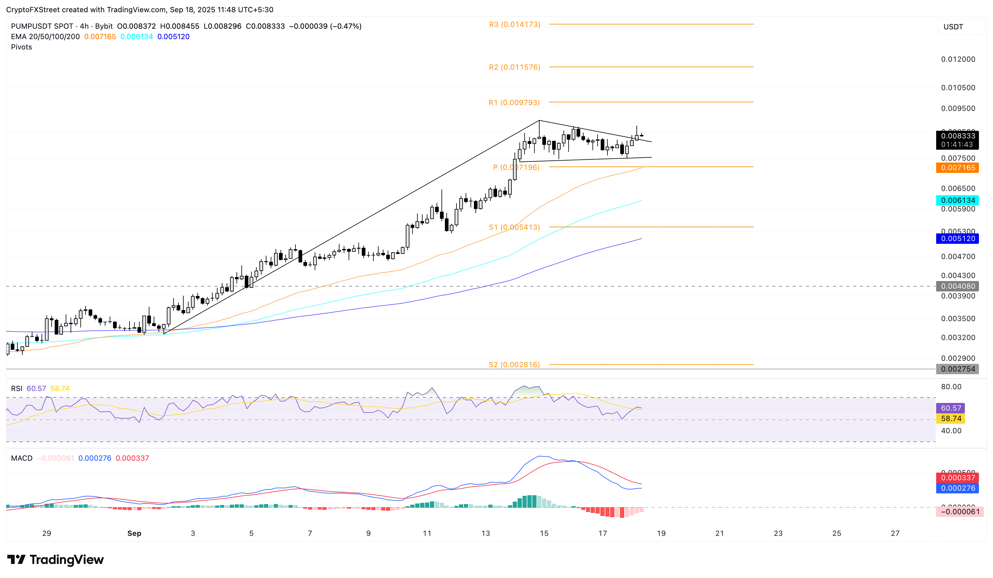 PUMP avanza un 1% en el momento de la prensa el jueves, superando una línea de tendencia de resistencia a corto plazo que marca un breakout del patrón de bandera alcista en el gráfico de 4 horas. La recuperación del breakout tiene como objetivo el nivel de pivote R1 en 0.009793$, que actúa como la resistencia inmediata.