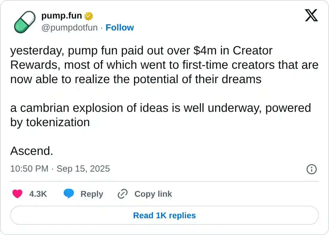 En medio del interés elevado, Pump.fun pagó recientemente más de 4 millones de dólares en recompensas a creadores, principalmente a creadores primerizos, como se publicó en la cuenta oficial de X el lunes. Esto indica una mayor adopción de la plataforma.