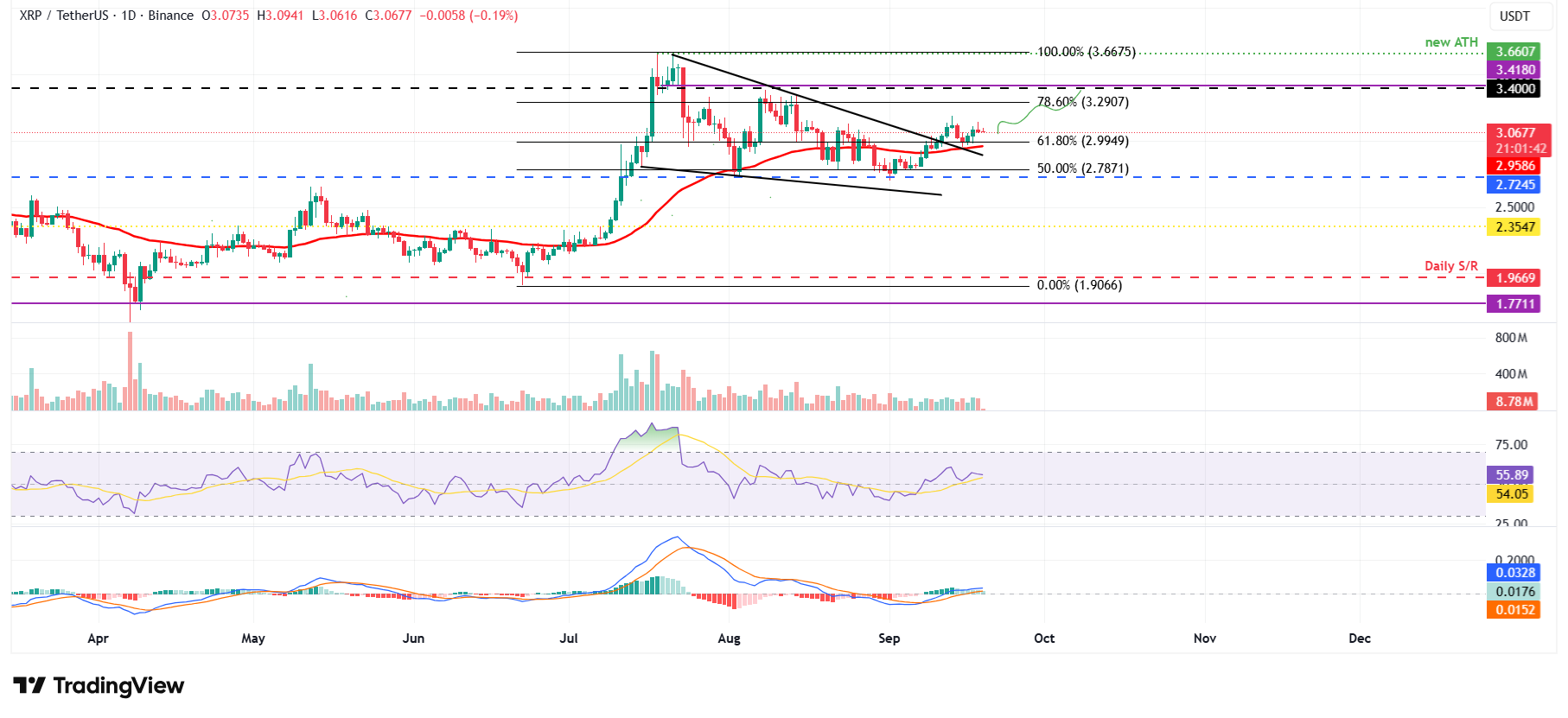 Si $XRP continúa su impulso ascendente, podría extender la recuperación hacia su resistencia diaria en 3.40 $.