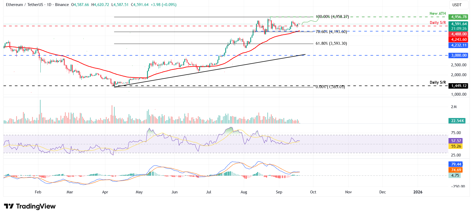 El precio de Ethereum rompió por encima del límite superior de consolidación en 4.488 $ el 12 de septiembre y se recuperó un 5.68%. Sin embargo, no logró mantener su impulso ascendente y cayó un 4.53% en los siguientes cuatro días, volviendo a probar su nivel superior de consolidación en 4.488 $ el martes. $ETH rebotó un 1.98% el miércoles desde este nivel de soporte y rondó los 4.500 $ al día siguiente. A partir del viernes, continúa estabilizándose alrededor de 4.500 $.